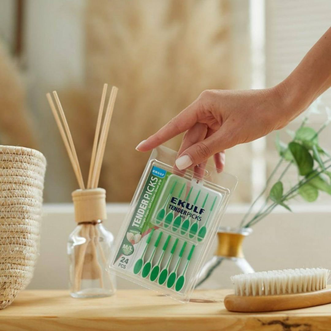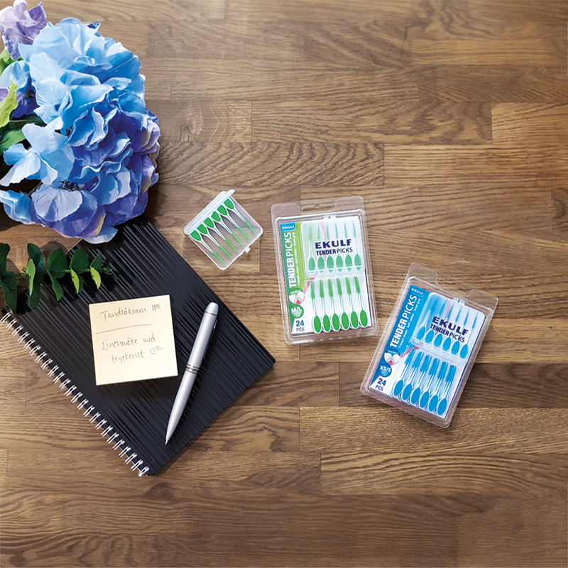 EKULF Tenderpicks is a hybrid toothpick and interdental brush. The toothpick is triangular and flexible with a soft rubber filament for a gentle cleaning. The handle has a rubber surface to ensure the best possible grip. Each blister pack has 24 tenderpicks and a handy travelpack that can hold 6 tenderpicks så you can easily bring them with you.– Maximum cleaning between the teeth.– Easy to use with only one hand.– Flexible and triangular to suit the tooth’s anatomy. Ribbed sides for an effective cleaning.– With daily use the risk of caries, gum infections and bad breath decreases.– Every blister pack includes 24 tenderpicks.– Travel case for 6 tenderpicks. Instructions: Insert with the flat side towards the gum line and bring it up. Repeat.