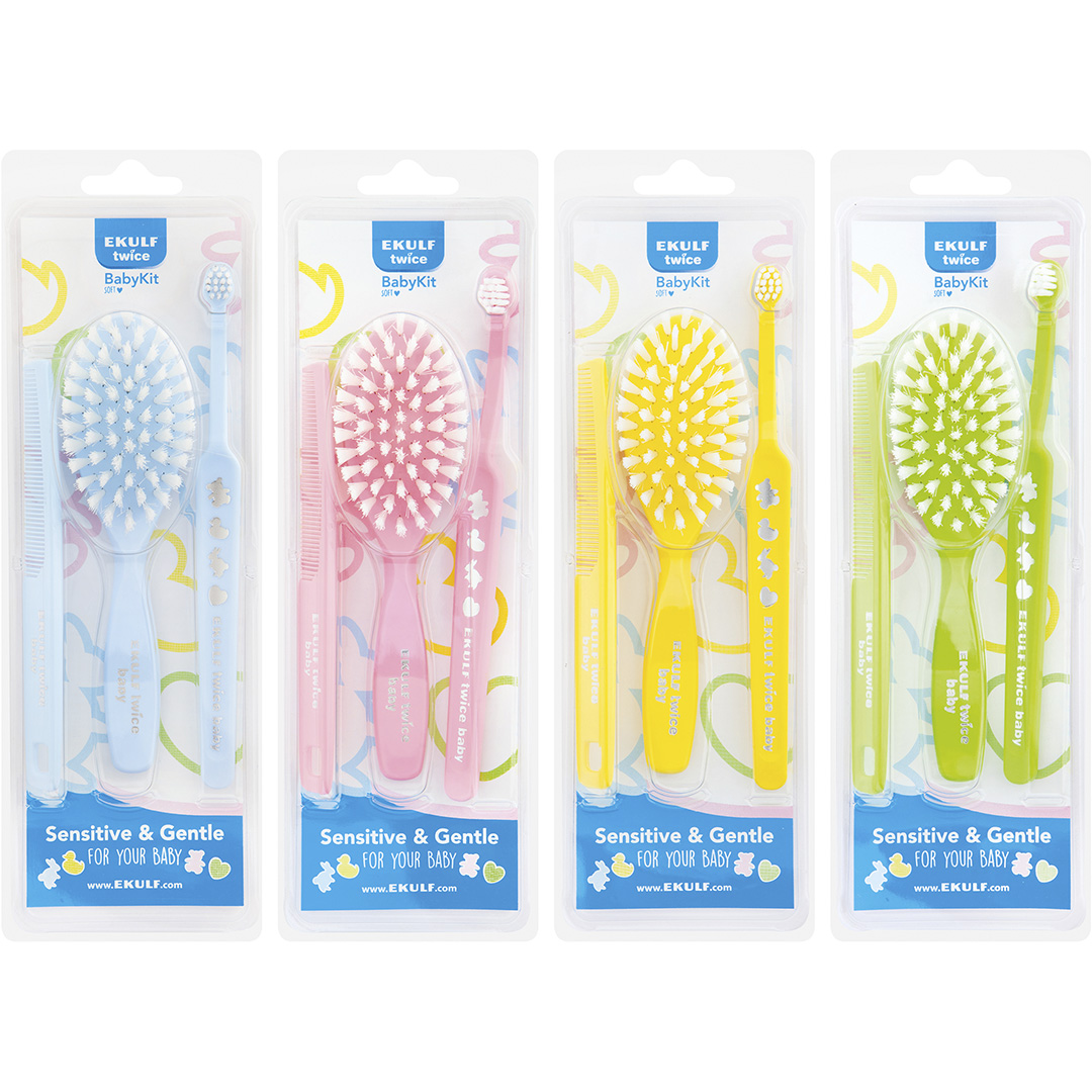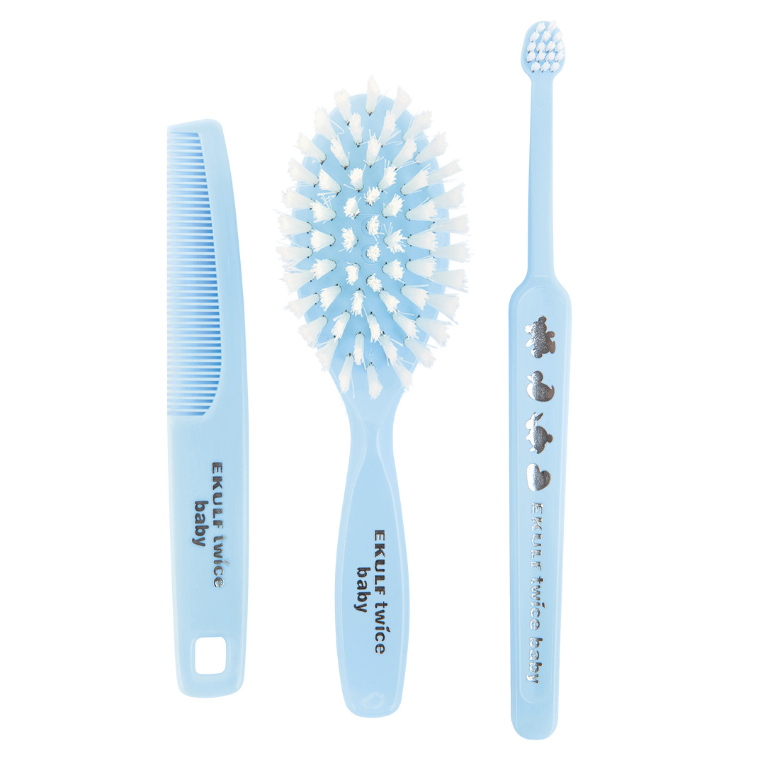 The kit includes:Toothbrush: The toothbrush has a long ergonomic handle which makes it easier to reach from all angles as well as the teeth in the back of the mouth. The brush head is small and compact which reduces the gag reflex. It has soft top rounded fibers which gives you a functional and gentle cleaning.Hairbrush: The brush has top-rounded polyester fibers which gives a soft and gentle brushing for your child’s sensitive scalp. The high fiber quality ensures that the brush will keep its flexibility and elasticity for a long time if used properly.Comb: The comb is top-rounded, small, flexible and fine-toothed.