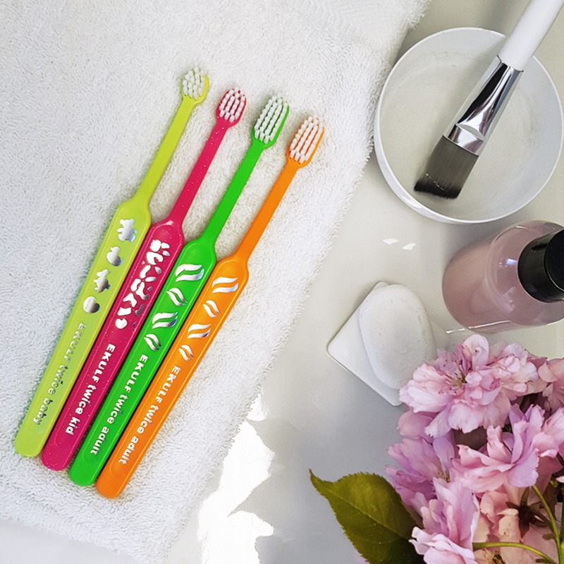EKULF twice toothbrush series is designed with top-rounded soft bristles that makes the brushing of the teeth and gum-stripes as gentle as possible. The brush head is significantly smaller than on a regular toothbrush, which makes it easy to reach all the surfaces of the tooth. By having a long, ergonomic handle, both parent and child can hold the toothbrush together. Thanks to the curved design, the toothbrush rests firmly in your hand and enables you to easily reach the back teeth.