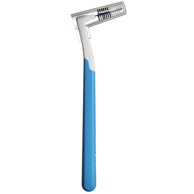Interprox angle plus has an angled neck to simplify cleaning from both the inside and the outside of the teeth. Each brush consists of a short 2-component handle which gives you control and a plastic cap to protect the brush. An interdental toothbrush should never be forced in between the teeth but rather glide easily.