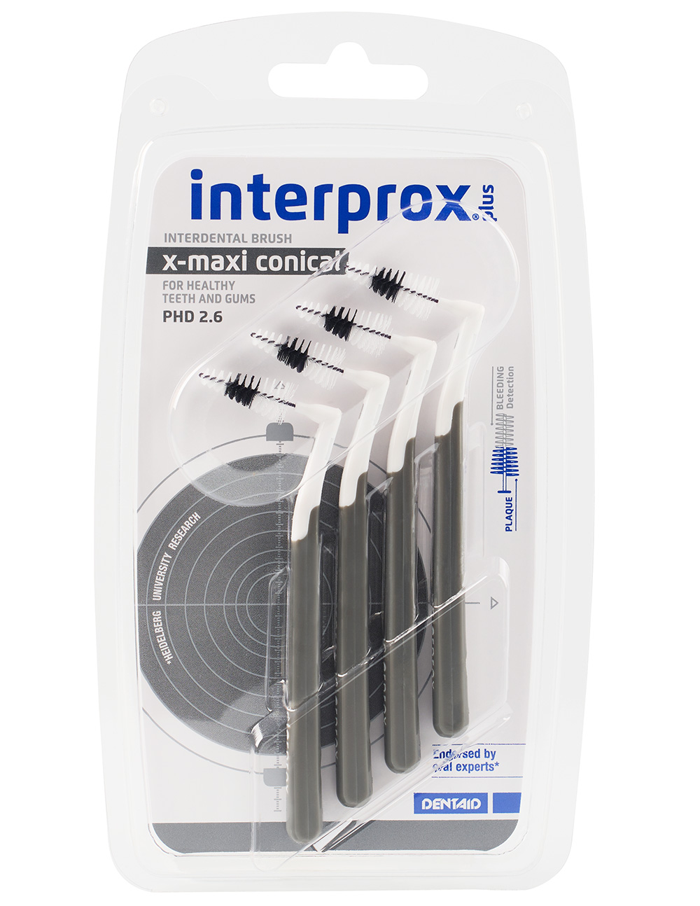 Interprox Plus has an angled head to facilitate cleaning from both the inside and the outside of the dental arch. Each brush consists of a short, two-component handle that provides excellent control, along with a plastic cap to protect the brush. An interdental brush should never be forced between the teeth but should glide smoothly.
